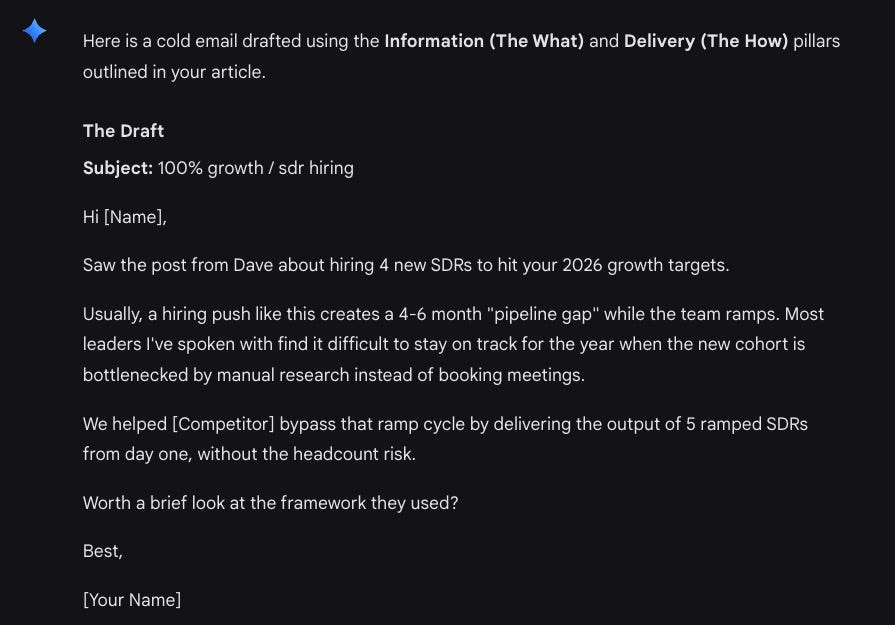 “Can you follow the strategies outlined in this article to write a cold email to a VP of sales if you were an AI selling an AI SDR? [Entire article up to “Putting it All Together” pasted here]”
