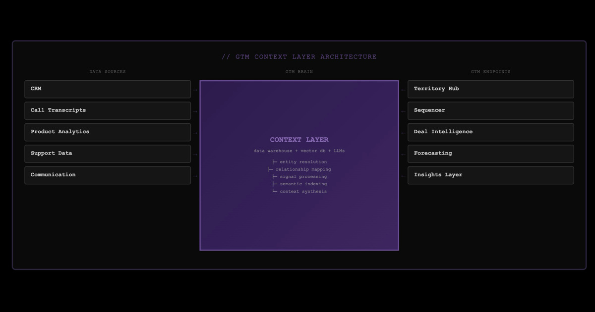 Every downstream workflow needs the same core capability: a shared “brain” that holds external and organization-wide context and can apply it to specific GTM actions.