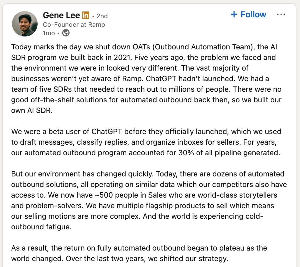This recently played out with Ramp sunsetting its Outbound Automation Teams.