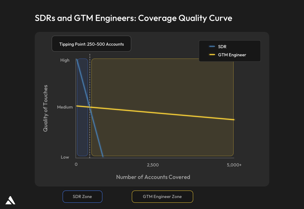 The companies building the most efficient go-to-market motions aren't choosing between GTM Engineers and SDRs. They're deploying each at the right stage: automation first to cover ground, then human touch to deepen relationships, then both working in tandem as the motion matures.